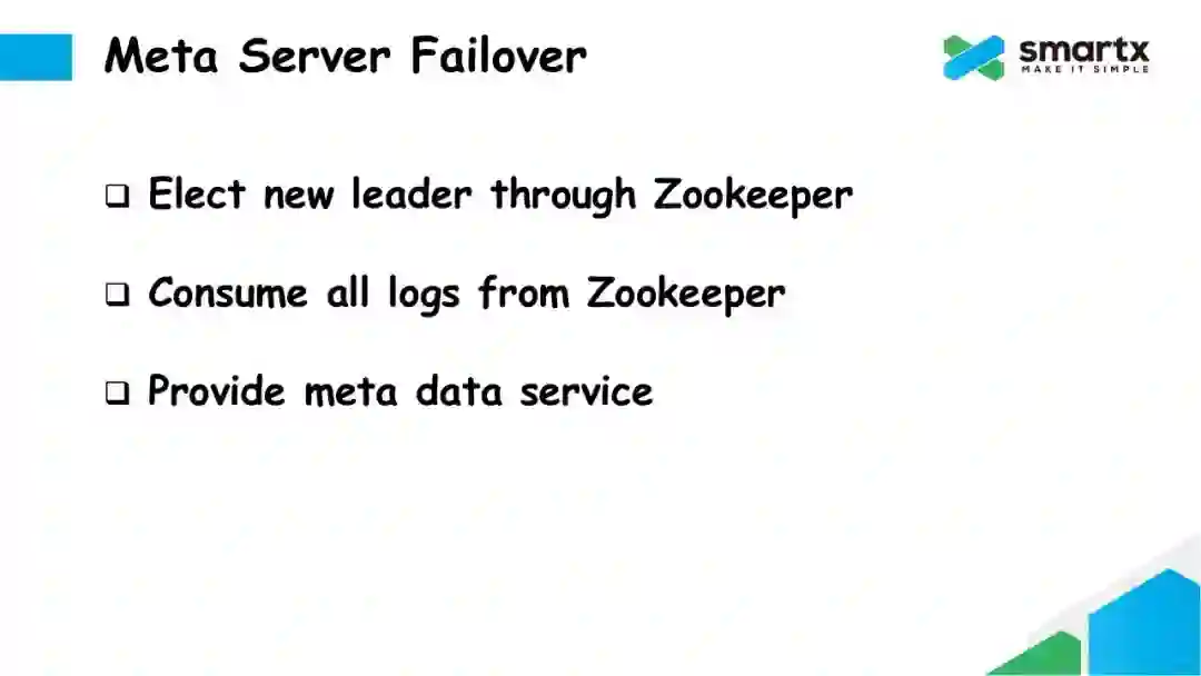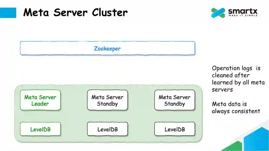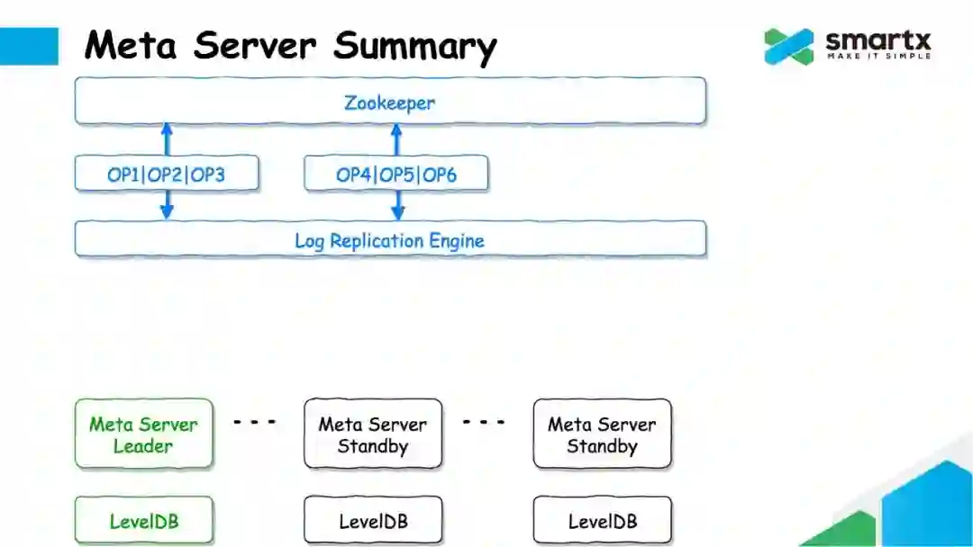 Failover 的逻辑也非常简单。如果 Leader 节点发生故障,其他还存活的的 Meta Server 通过 Zookeeper 再重新进行一次选主,选出一个新的 Meta Leader。这个新的 Leader 将首先从 Zookeeper 上同步所有还未消耗的日志,并在提交到本地的 LevelDB 中,然后就可以对外提供元数据服务了。