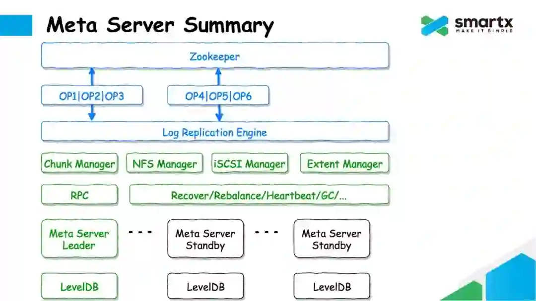 在 Log Replication Engine 的基础之上,我们实现了整个 Meta Sever 的逻辑,其中包含了 Chunk Manager,NFS Manger,iSCSI Manager,Extent Manager 等等很多管理模块,他们都可以通过 Log Replication Engine,管理特定部分的元数据。RPC 模块是 Meta Server 对外暴露的接口,负责接收外部的命令,并转发给对应的 Manager。例如创建 / 删除文件,创建 / 删除虚拟卷等等。此外,Meta Server 中还包含了一个非常复杂的调度器模块,里面包含了各种复杂的分配策略,恢复策略,负载均衡策略,以及心跳,垃圾回收等功能。