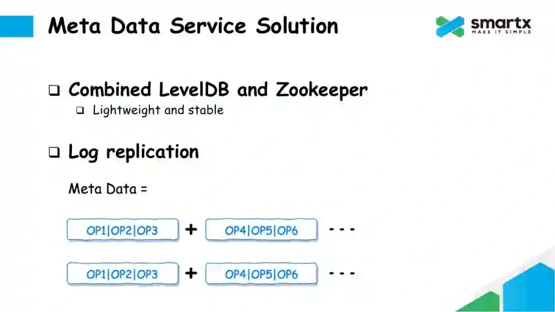 以上介绍的方法都存在各种各样的问题,并不能直接使用。最终 ZBS 选择了使用 LevelDB(也可以替换成 RocksDB) 和 Zookeeper 结合的方式,解决元数据服务的问题。首先,这两个服务相对来说都非常轻量级;其次 LevelDB 和 Zookeeper 使用在生产中也非常稳定。