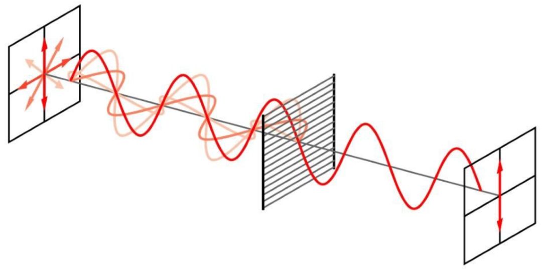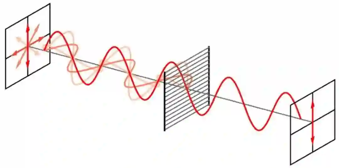 线偏振器将非偏振光变成一束单一的线偏振光,所有波的垂直分量透射,而水平分量被吸收和反射。