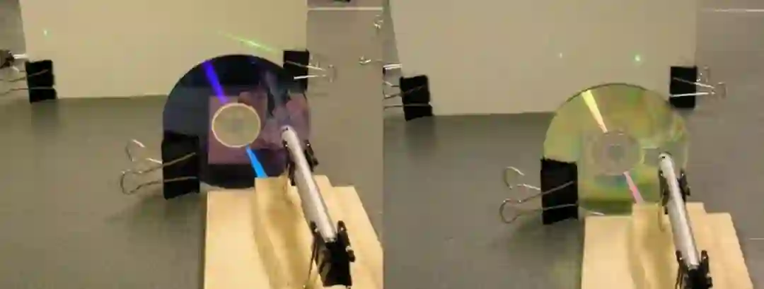 之所以会出现这种现象,是因为光存储介质中存在着微小的凹槽,光斑之间的距离和凹槽之间的间距成反比。光斑之间的距离越小,凹槽之间的距离越大,这就意味着这张光盘可以存储的数据越少。如果你有一张CD和一张DVD,不妨检查下两张光盘产生的光点之间的距离。这种方法可以验证光的波动性。