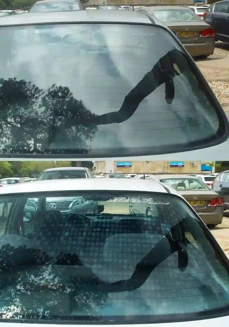 当用偏振滤光镜拍摄时,只有一部分光线(特定方向偏振的光线)投射,这就使得我们可以看到后窗玻璃的缺陷。