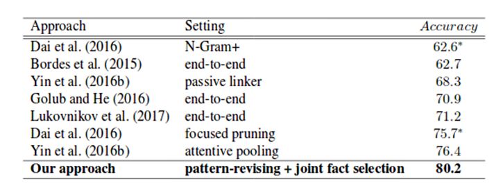 实验评价指标为准确率,仅当问题对应的事实与模型得到的实体和谓词两者都匹配时,才算准确匹配。