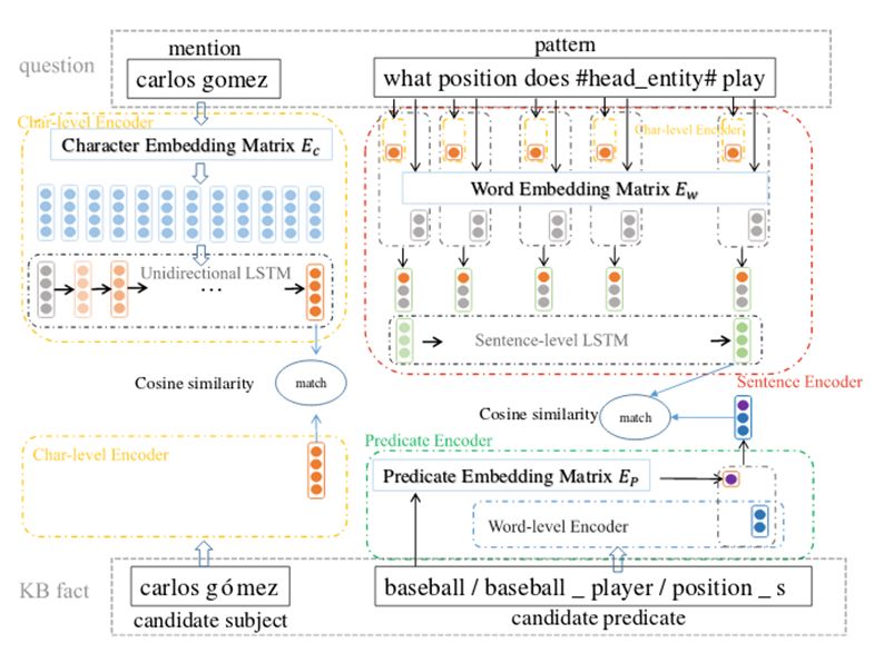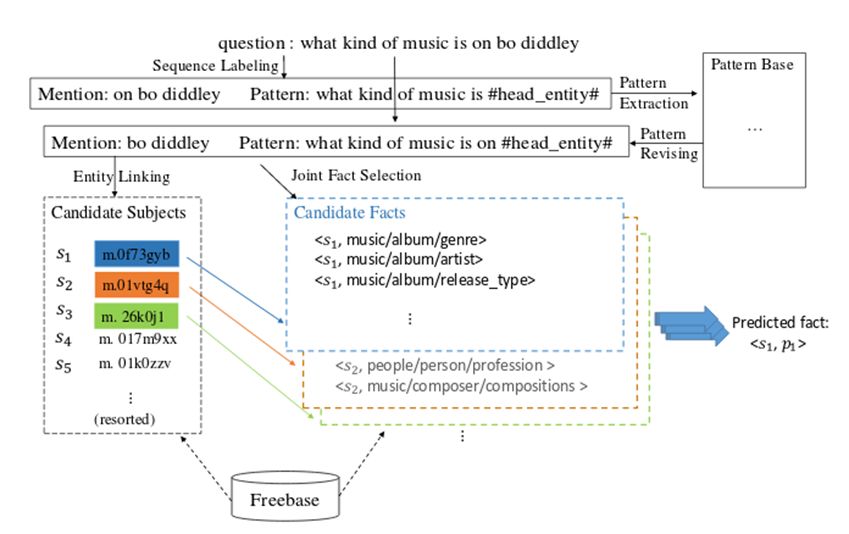 考虑到这些问题,本文首先使用模式抽取和实体链接,将可能的实体描述和问题模式提取出来,而后减少知识库中的候选实体数量。