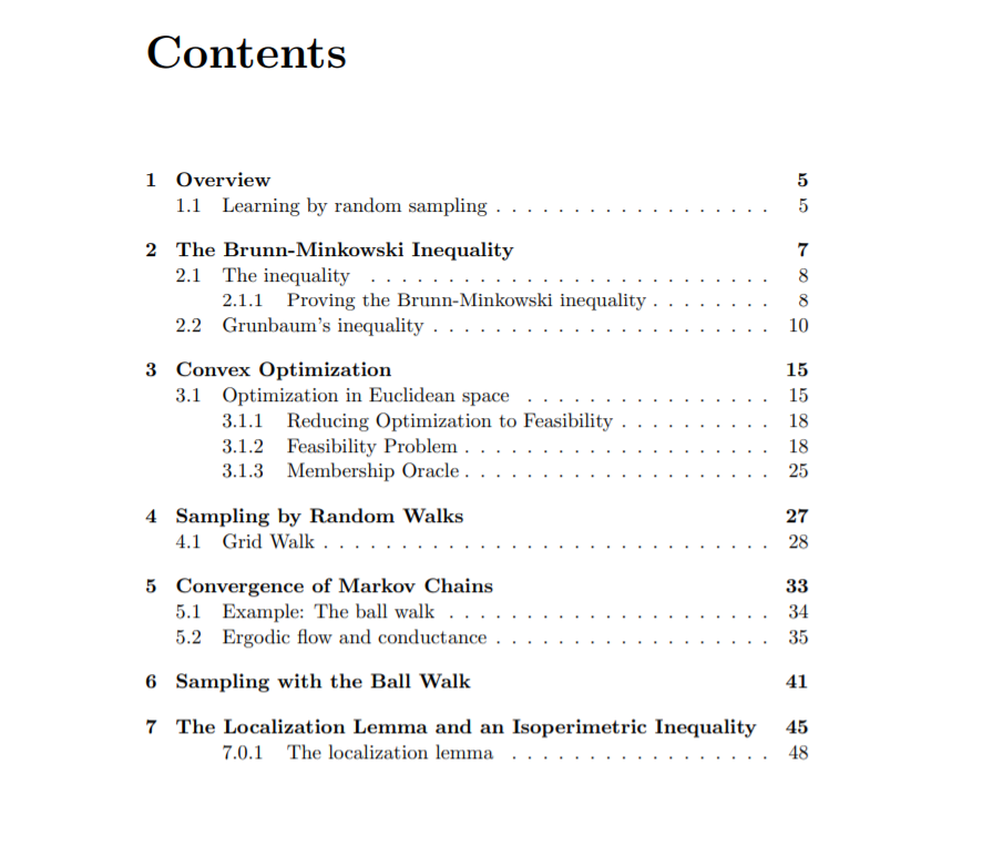 在凸性假设下,几何算法问题往往变得易于处理。优化,体积计算,几何学习和寻找质心都是凸集明显容易的问题的例子。我们将对这一现象进行深入的研究,探索三个相互联系紧密的路径。第一个是几何不等式理论。我们从经典的主题开始,如Brunn-Minkowski不等式,然后处理更近期的发展,如凸体的等周定理及其对对数凹函数的推广。第二个轨迹的动机是通过随机游走对几何分布进行抽样。这里我们将开发一些通用工具并使用它们来分析几何随机游动。第一条轨迹的不等式在限定这些轨迹的收敛速度方面起着关键作用。最后一个方面是采样和各种算法问题之间的联系,最显著的是,计算凸体的体积(或更普遍地说,积分一个对数凹函数)。有些令人惊讶的是,随机抽样将是用于这些问题的多项式时间算法的常见和基本特征。在某些情况下,包括体积问题,随机游走采样是唯一已知的得到多项式时间算法的方法。