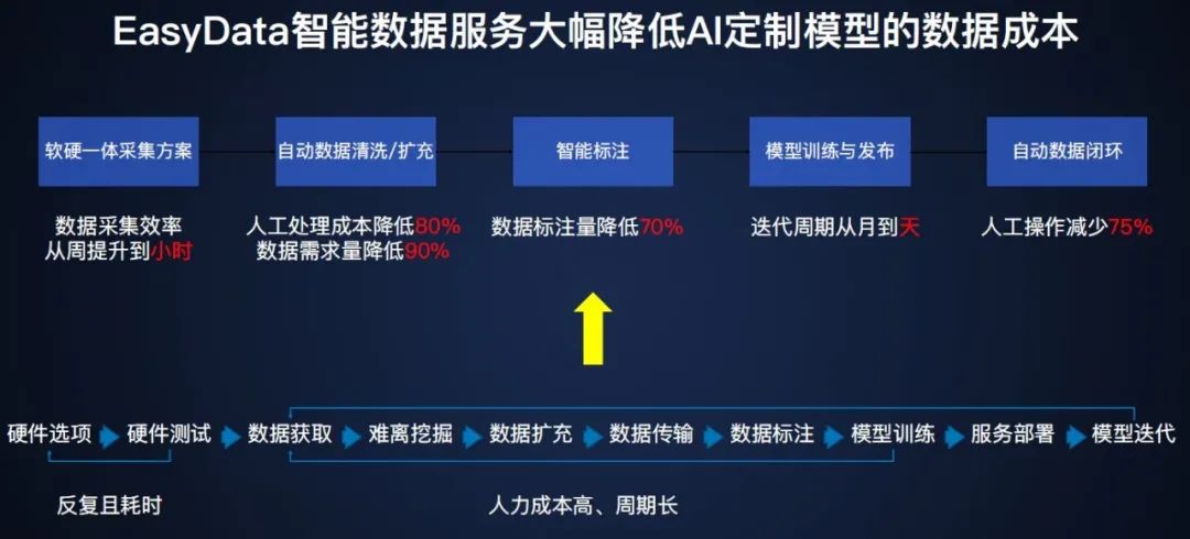 EasyData智能数据服务大幅降低了AI定制模型的数据成本。用户如果需要进行全流程的数据采集、数据标注、模型迭代,就会涉及非常多环节,而且需要不断的迭代。而EasyData把整个流程抽象成了5个模块:软硬一体数据采集方案,自动数据清洗/扩充,智能标注,模型训练与发布,自动数据闭环。通过这五大模块的能力,帮助用户把数据采集、模型训练以及最后人工部署的成本都尽可能降低。