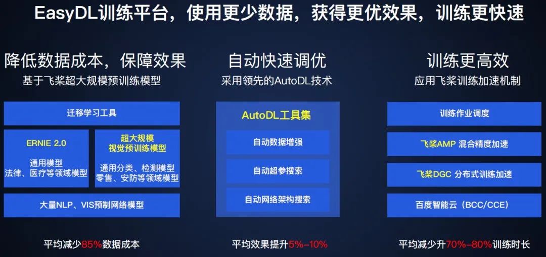 EasyDL训练平台可以帮助用户使用更少的数据,获得更优的效果,而且训练速度更快。具体来说,基于百度自研的大规模预训练模型,大幅降低了数据成本;模型的调优方面,采用了领先的AutoDL技术;在训练方面,应用了飞桨内的训练加速机制。