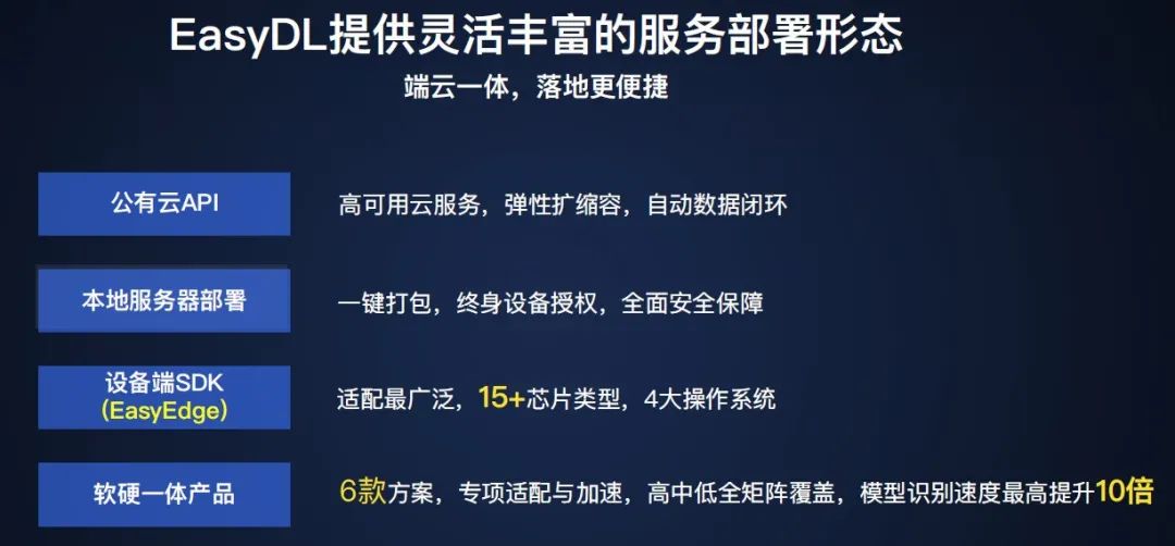 第三部分是端云一体服务部署,支持公有云部署、私有化部署和设备端部署(EasyEdge)。