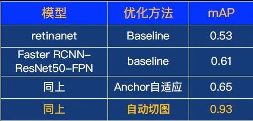 回到案例,采用这种自动切图技术,效果从0.65直接提升到0.93,这个效果的跨越幅度非常大。这也证明了自动切图算法能够从根本上能够解决小目标检测的问题。