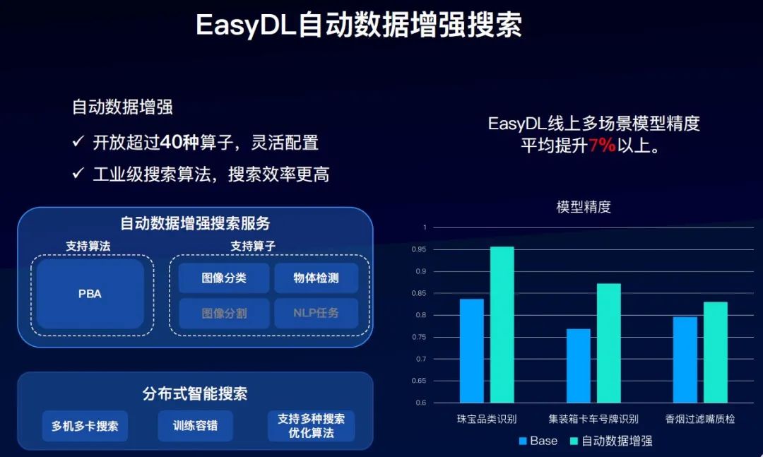 并且提供了工业级的搜索算法,搜索的效率更高。在EasyDL线上的多场景模型精度上,平均提升了7%以上。
