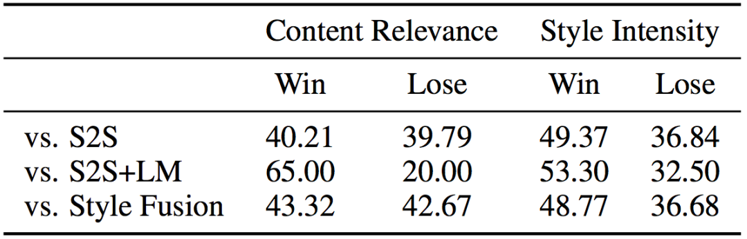 表1展示了人工评价结果,该评价借助亚马逊人工标注平台,将每一个测试样本同时分发给5位标注者。每位标注者被要求在给定对话历史的条件下,在本文方法和一个基线方法回复中选择出哪一个更好。可以看出,在内容相关性方面,本文方法取得了和最佳基线方法相近的效果;在风格强度方面,本文方法显著优于所有基线方法,证明了其可以在保持相关性的同时显著提升风格强度。