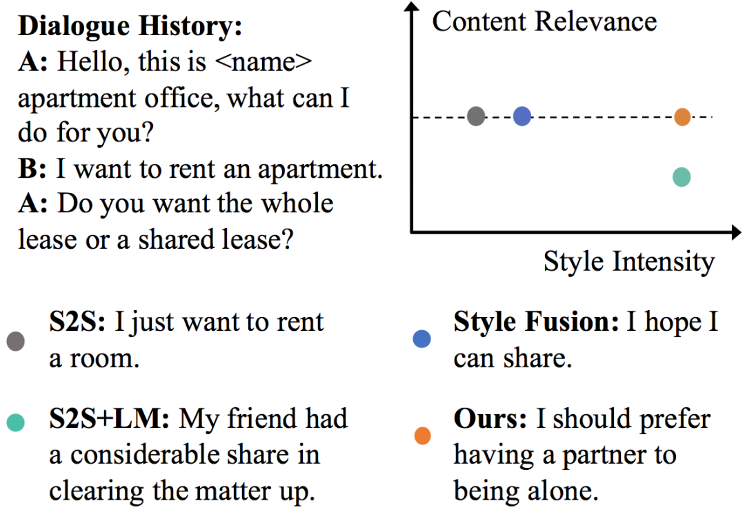 该方法通过隐变量空间的对齐,有效缓解了回复相关性较差的问题,但同时也限制了回复风格强度。图2从回复内容相关性和风格强度两个维度展示了已有方法的现状:内容相关性和风格强度之间存在着较为明显的trade-off关系,一个维度的提升会带来另一维度的降低。