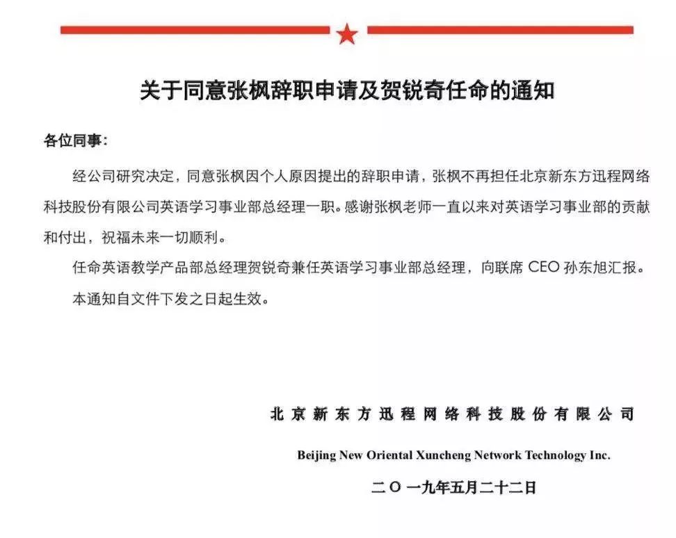 在这个变动行列中的,既包括英语学习事业部总经理张枫、儿童产品事业部总经理(多纳)陈婉清这样的一线业务部门领导,也包括客服部总监蔡凌、互联网中台部包颖等支持部门负责人。其中,「新东方在线」内部发文显示,张枫因个人原因离职,由贺锐奇接任;而包颖据了解则已调往新东方旗下的在线职业教育平台职上网。