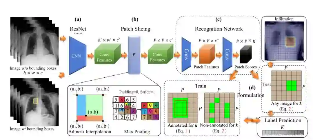 其模型工作原理也比较简单,先用Resnet进行特征提取,接下来通过全卷积网络进行分类,输出每种分类的得分,再使用多实例学习来学习多种类型图像,最后输出 图像类别以及对应区域的位置。