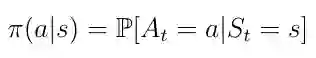 在这我们将讨论主体如何决定在特定状态下必须采取哪些行动。 这由所谓的策略 π(方程11)决定。 从数一点上,学角度讲,政策是对给定状态的所有行动的分布。 策略确定从状态 s 到主体必须采取的操作 a 的映射。