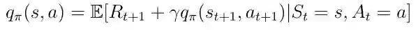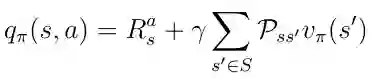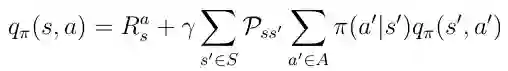 现在我们知道了这些函数之间的关系,我们可以将方程式16中的v(s)插入方程式17中的q(s,a)。 我们得到方程18,可以注意到当前q(s,a)和下一个动作值q(s',a')之间存在递归关系。