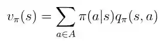 在这个例子中处于状态 s 允许我们采取两种可能的动作 a 。 根据定义,在特定状态下采取特定动作会给我们动作值q(s,a)。 值函数v(s)是在状态 s(等式16)中采取动作a的概率加权的可能q(s,a)的总和(其不是策略 π 除外)。