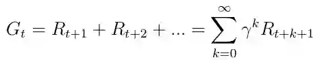 感兴趣的主要话题是总奖励Gt(等式5),它是主体将在所有状态的序列中获得的预期累积奖励。 每个奖励都由所谓的折扣因子γ∈[0,1]加权。 折扣奖励在数学上是方便的,因为它避免了循环马尔可夫过程中的无限回报。 除了折扣因素意味着我们未来越多,奖励变得越不重要,因为未来往往是不确定的。 如果奖励是金融奖励,立即奖励可能比延迟奖励获得更多利息。 除了动物/人类行为表明喜欢立即奖励。