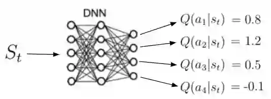 除状态-价值函数之外的另一个重要功能是所谓的动作-价值函数q(s,a)(等式13)。 动作-价值函数是我们通过从状态s开始,采取行动 a 然后遵循策略 π 获得的预期回报。 请注意,对于状态s,q(s,a)可以采用多个值,因为主体可以在状态s中执行多个操作。 Q(s,a)的计算是通过神经网络实现的。 给定状态作为输入,网络计算该状态下每个可能动作的质量作为标量(图7)。 更高的质量意味着在给定目标方面采取更好的行动。