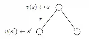 价值函数的分解(公式8)也称为马尔可夫奖励过程的 Bellman 方程。 该函数可以在节点图中显示(图6)。 从状态s开始导致值v(s)。 处于状态s我们有一定的概率Pss'最终在下一个状态s'。 在这种特殊情况下,我们有两个可能的下一个状态。为了获得值v(s),我们必须对由概率Pss'加权的可能的下一个状态的值v(s')求和,并从状态s中添加直接奖励。 如果我们在等式中执行期望算子E,则得到等式9,这不是等式8。