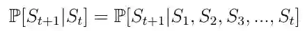 马尔可夫过程是描述一系列可能状态的随机模型,其中当前状态仅依赖于先前状态。 这也称为Markov Property(Eq.1)。 对于强化学习,这意味着AI主体的下一个状态仅取决于最后一个状态而不是之前的所有先前状态。