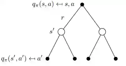 这种递归关系可以再次在二叉树中可视化(图10)。 我们从q(s,a)开始,以一定的概率Pss'结束于下一个状态s'从那里我们可以用概率 π 采取行动 a' 并且我们以动作值 q 结束(s', 一个')。 为了获得q(s,a),我们必须在树中上升并整合所有概率,如在 等式 18中可以看到的那样。