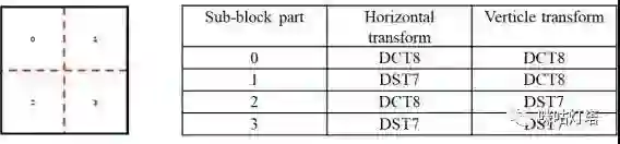 AVS3相比上一代编码标准,支持更加灵活的变换。针对超高清视频的编码中出现的大编码单元,采用最大为64x64的DCT变换。AVS3也支持二次变换,对使用帧内预测方式进行编码的块,考虑到其残差的特殊统计特性,通过对左上角4x4块的系数进行二次变换,进一步减少了编码冗余,使得变换系数进一步集中。此外,AVS3提出了基于位置的变换技术PBT。PBT考虑编码单元中不同位置的预测残差特性,将一个变换单元四叉树划分为四个单元,对行变换和列变换分别使用DCT8、DST7两种变换核,进一步提升了变换编码的效率,如下图为四个子块的行列变换绑定方式,这种基于位置的绑定方式能有效地适应不同位置帧间残差的分布规律,提升了变换的性能且具有较低的复杂度。