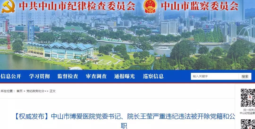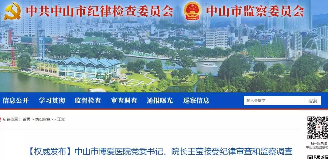 2018年4月9日,中山纪检监察官网发布消息,中山市博爱医院党委书记、院长王莹涉嫌严重违纪违法,目前正在接受纪律审查和监察调查。