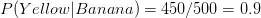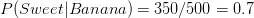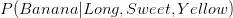 第一步:想要计算水果是香蕉的概率,我们首先发现这个式子看起来很熟悉。这就是在属性为长形、甜和黄色的条件下,水果是香蕉类的概率,这个表达更简洁一些: