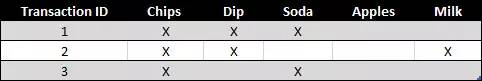 举个 Apriori 算法的例子:我们假设有一个充满超市交易数据的数据库,你可以把数据库想象成一个巨大的电子数据表,表里每一行是一个顾客的交易情况,每一列代表不用的货物项。