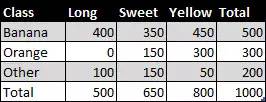 如果我们根据长度、甜度和水果颜色,在不知道它们类别的情况下,我们现在可以计算水果是香蕉、橘子或者其他水果的概率了。