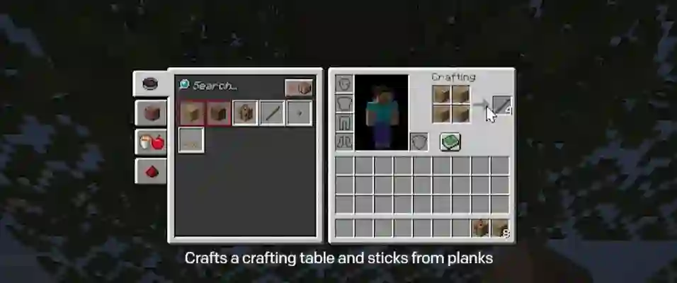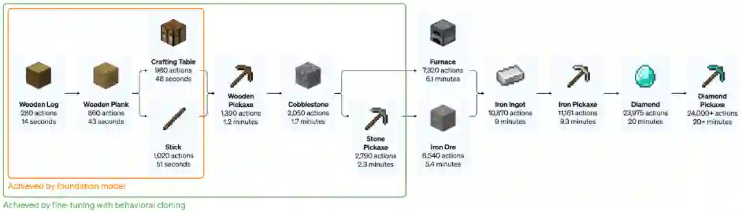 此外,该模型还可以执行人类在游戏中经常执行的其他复杂技能,例如游泳、狩猎动物、食用食物以及一些《我的世界》专用技能。