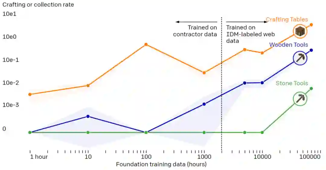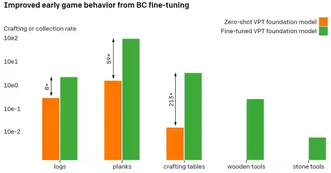 呢?OpenAI 让人类玩家在最新版《我的世界》中玩了 10 分钟,并用基本的材料建造房子。OpenAI 希望这能增强基础模型执行早期游戏技能的能力。结果表明,基础模型在可靠执行早期游戏技能方面有了巨大进步,而且微调后的模型还掌握了制作石器等新技能。
