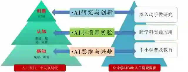 中国人民大学附属中学在今年10月份组织了中小学人工智能课程建设专家座谈会,邀请了来自清华、北大、中科院、航天科技、人工智能前沿企业等十几位专家教授前来指导。在专家们的指导建议下,结合人大附中实践,从面向全体的普及教育,到部分选修的跨学科实践应用,再到少数的深入动手做研究,梳理了金字塔形的中小学“STEAM+人工智能教育”课程体系,重构了与人工智能本身感知、认知、创新三个层次相对应中小学人工智能教育课程体系。