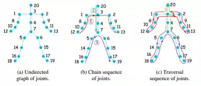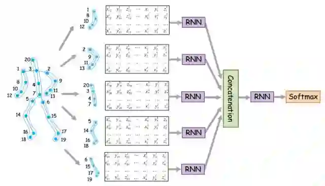 早期基于骨架的行为识别方法主要基于手工设计对行为分析有用的特征。这些手工特征的表达能力有限,不能适应大规模行为识别的任务。最近两年出现了一些端到端的基于递归神经网络(Recurrent Neural Networks, 简称RNN)的算法,可以直接处理原始数据并预测行为。这些方法把每个时刻的关键点坐标拼接成一个向量,不同的时间的坐标向量组成一个序列,然后采用RNN网络学习特征的表达并直接预测行为。实际上,人体不同关键点的数据是具有空间结构关系的。之前基于RNN的方法只考虑了骨架坐标随着时间的动态演变,而忽略了它们在某一个时刻的空间关系。