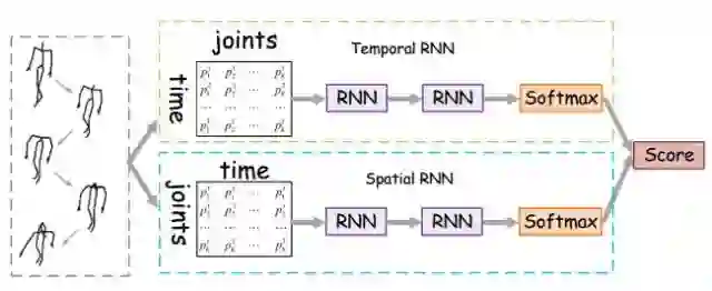 我们的方法采用两个RNN网络(时间通道的Temporal RNN和空间通道的Spatial RNN)处理人体骨架关键点数据,最后在分数层采用加权平均的方式融合。这两个网络可以作为一个端到端训练的整体。