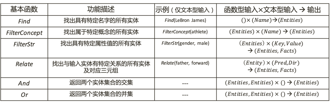 KoPL设计了14个基本函数,以支持对上述7种知识元素的操作。如Find函数找出具有特定名字的所有实体;FilterConcept函数找出属于特定概念的实体;Relate函数找出与输入实体有特定关系的所有实体。另外,KoPL还支持And和Or函数,通过两个实体集合的交和并来实现逻辑推理。图4展示了部分知识操作函数的功能描述、示例和输入输出。每个函数有两部分输入:一部分是函数输入(functional input),来自于其他函数的输出;另一部分是文本输入(textual input),来自于问题所指定的条件。