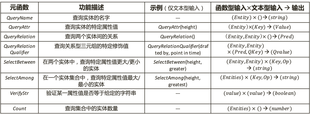 KoPL设计了13个基本函数,以支持多种类型的问答,包括查询某种知识元素、比较、事实验证、计数等。如QueryName查询实体的名字;SelectAmong在一个实体集合中,查询特定属性值最大/最小的实体;VeiryStr验证某一属性值是否等于给定的字符串;Count函数查询集合中的实体数量。图5展示了部分查询函数的功能描述、示例和输入输出。