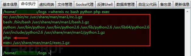 验证是否反弹命令不存在。我常用的几个反弹命令:nc/nc.openbsd/nc.traditional、bash/sh/dash、python/perl/PHP/ruby、exec。