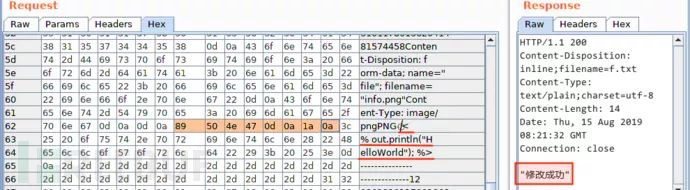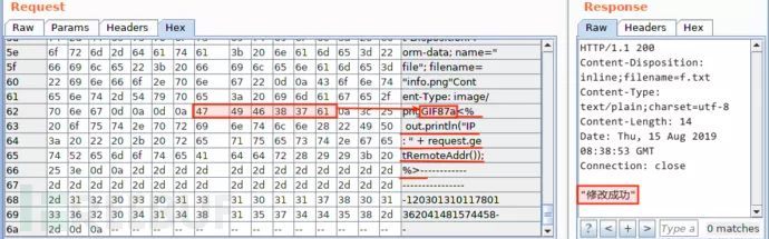 验证是否检测了文件头。不同类型的文件都有对应的文件类型签名(也叫类型幻数,简称文件头),比如,PNG 的文件头为十六进制的 89 50 4E 47 0D 0A 1A 0A、GIF 为 47 49 46 38 37 61、JPG 为 FF D8 FF E0。于是,我添加了 PNG 文件头后再次上传: