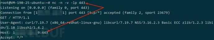 等待片刻,VPS 的并无 HTTP 记录,所以,怀疑采用白名单。经验来看,端口白名单通常只允许向外访问 HTTP 服务的默认 80、HTTPS 服务的默认 443,于是,VPS 监听 443 端口,目标上访问 443,这时 VPS 上获得 443 端口的访问记录: