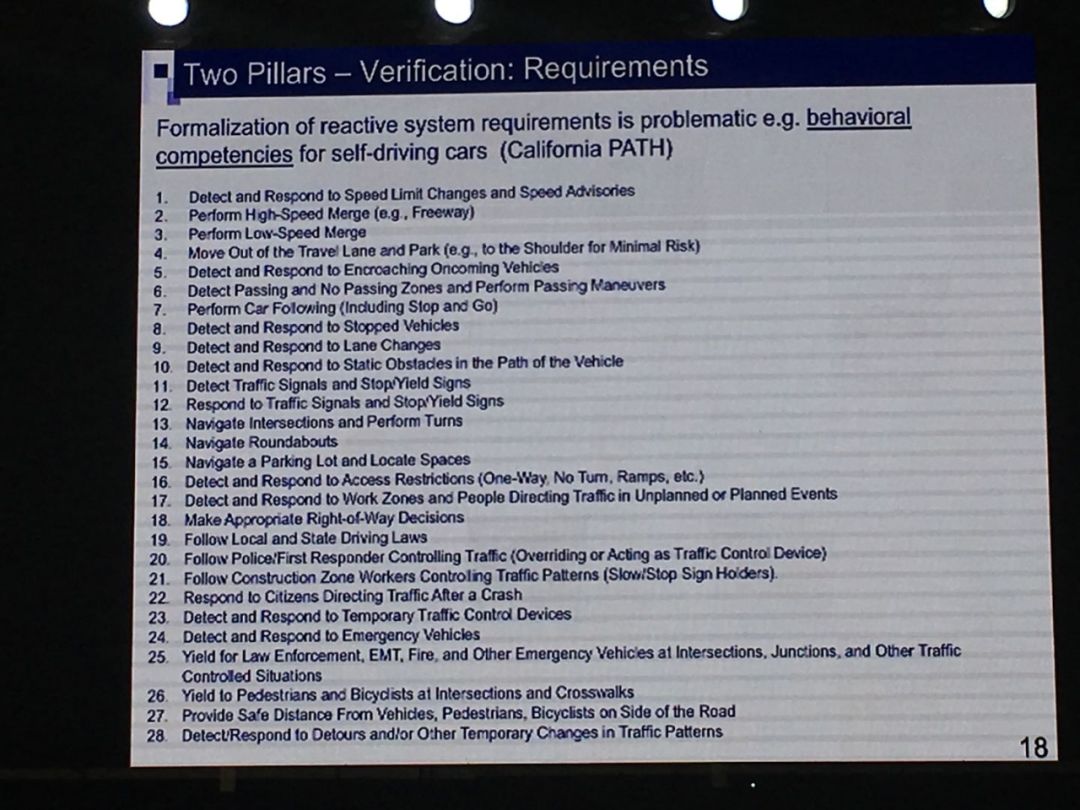 在验证方面,我有 20 多年的工作经验,验证已经成功应用于软件和硬件领域。对于自动系统,我们需要的是要求的形式化,下图是自动驾驶的 28 项要求。