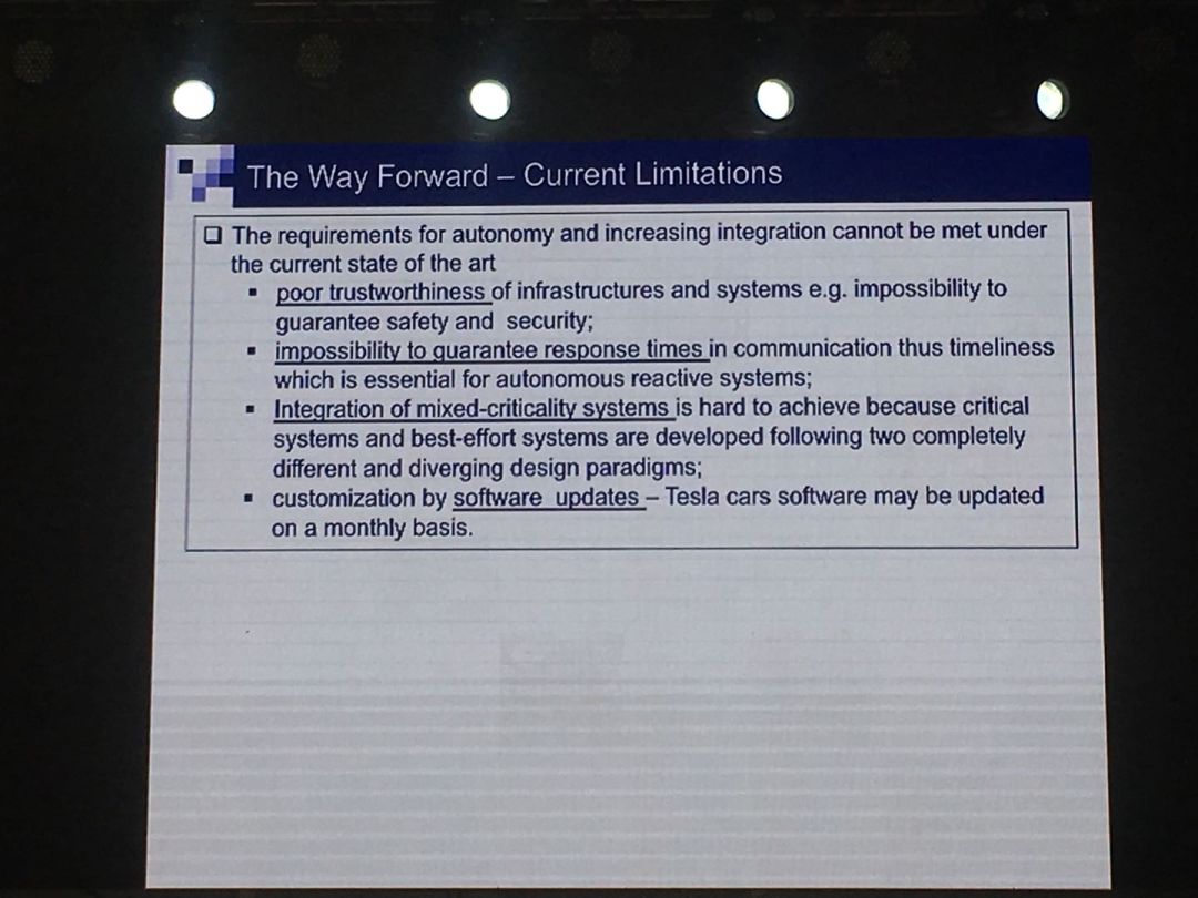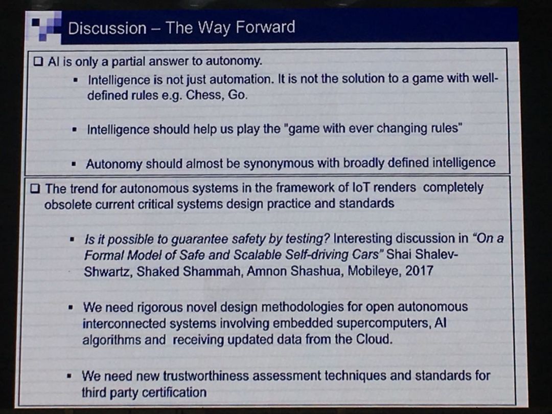 接下来我想说,目前无人驾驶汽车等自主化系统案例都非常引人注目,我们设定了一些标准来允许在对这些自主化系统进行质量上的检测。还包括在研发过程当中,提供决定性的证据,来校正这个系统和一些错误的形态。如特斯拉汽车,它会自我验证,它们在研发的过程当中都必须要进行验证,但在一开始,需要对这个车进行安全性的验证。