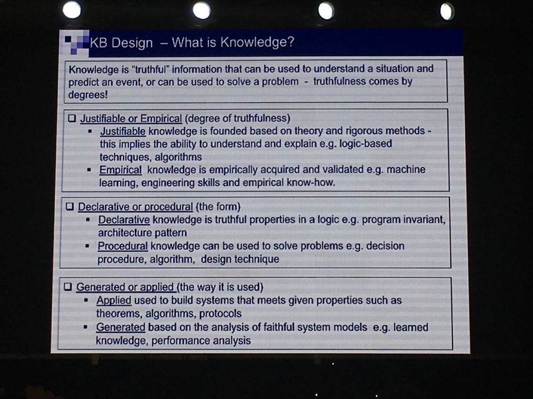 真实的信息可以用来理解一种情景,或者用来解决一个问题。这里,我们有不同的知识的分类,工程师所运用的知识分类。比如说,我们有可证明的信息或者实验性的知识。机器学习就是一种实验性的知识。我们的工程师和科学家也会产生一种知识,并应用知识。