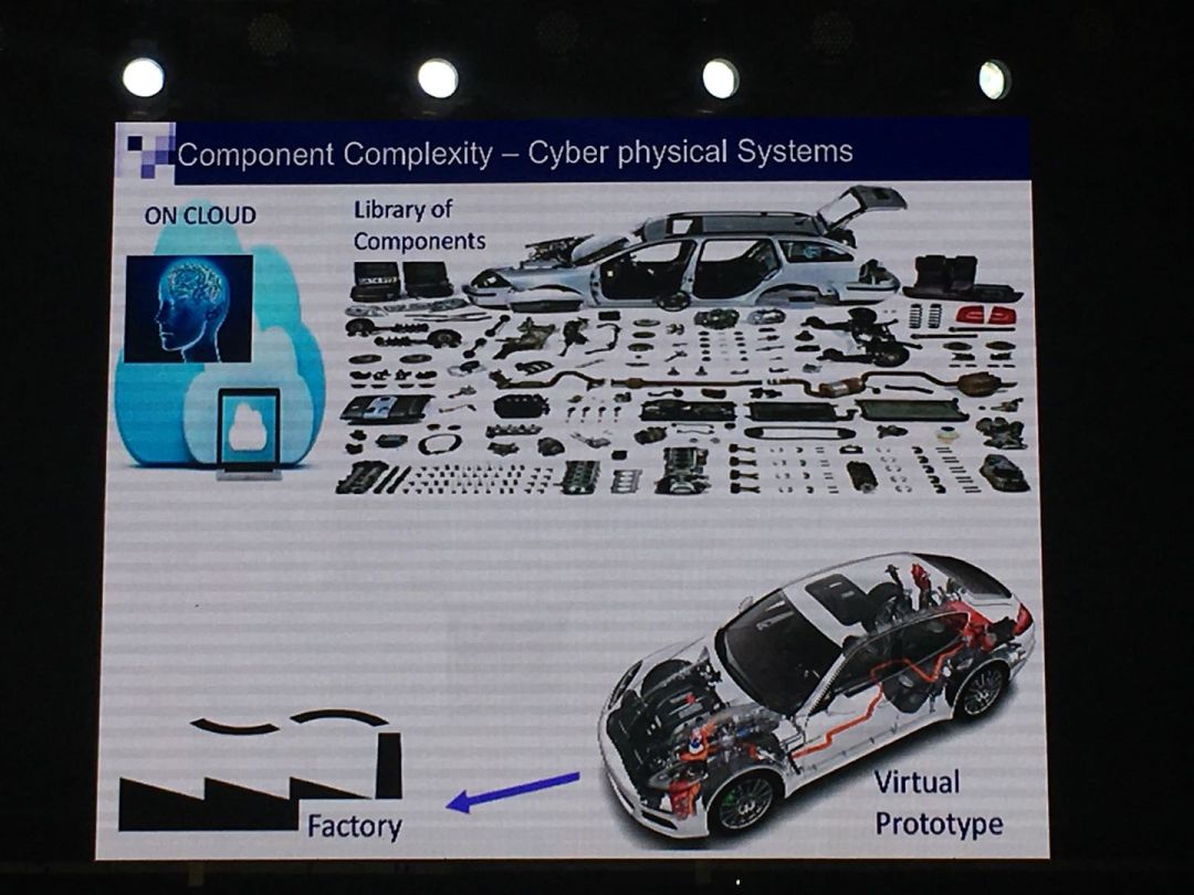 我来向大家展示该信息物理系统,未来,所有的物体(无论是汽车还是其它的元件)都基于信息物理系统。也就是说,存在机械的部件,但是每一个机械部件都有一个计算机软件来对应它。不同的零部件对应不同的电脑软件。这里,有一些可靠的软件部件,还有硬件,我们用两个构件来构成这样一个模拟的自动驾驶系统模型,再将模型发送到工厂,这就是工业 4.0 的概念。