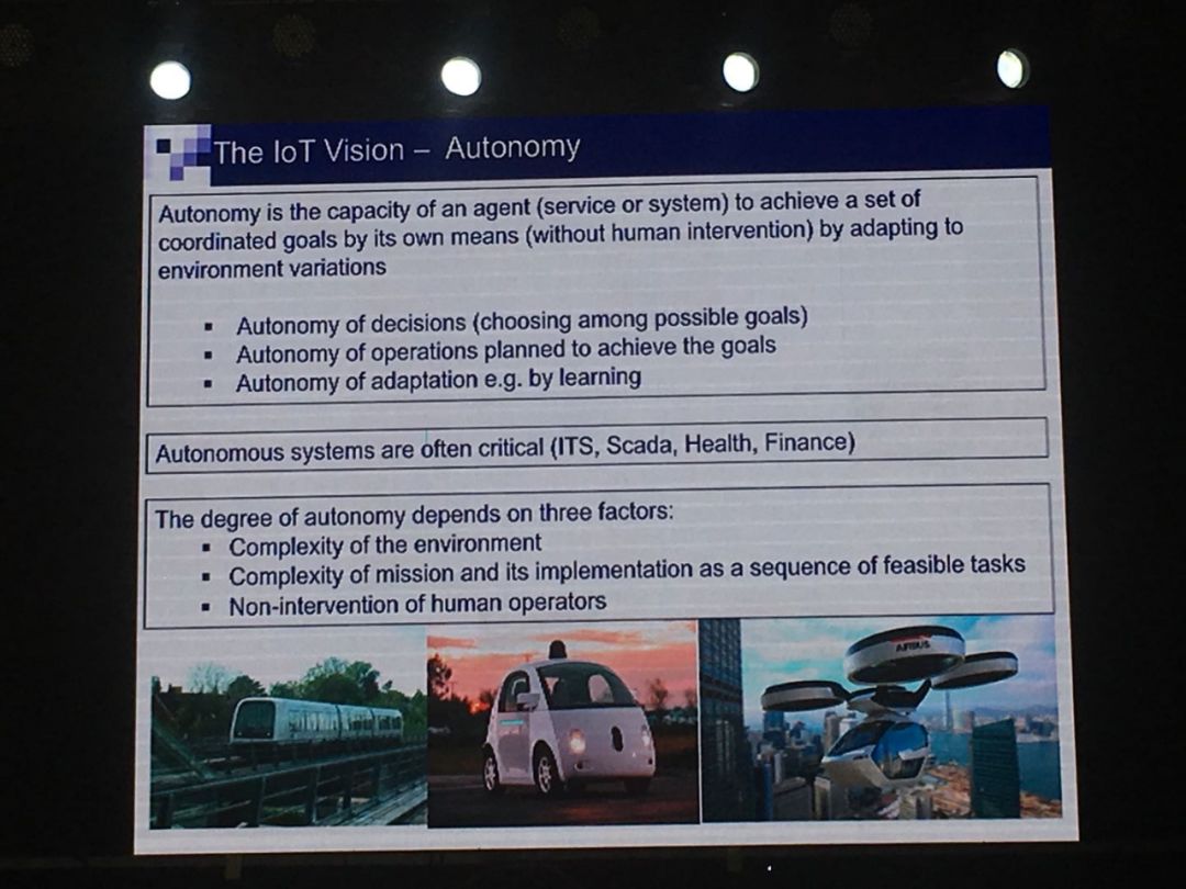 美国于 5 年前成立了一个工业互联网的联盟,即物联网。发展物联网要涉及到不同的方面:包括自主的决策、自主的运营、自主的学习,这也就是自主的意义。重中之重的是,我们必须了解这个自主系统,它具有不同的自主程度(不同的自主程度取决于环境的复杂度),以及使命的复杂度,还有一些人类活动的可行性的执行和非人类操作员的干涉。