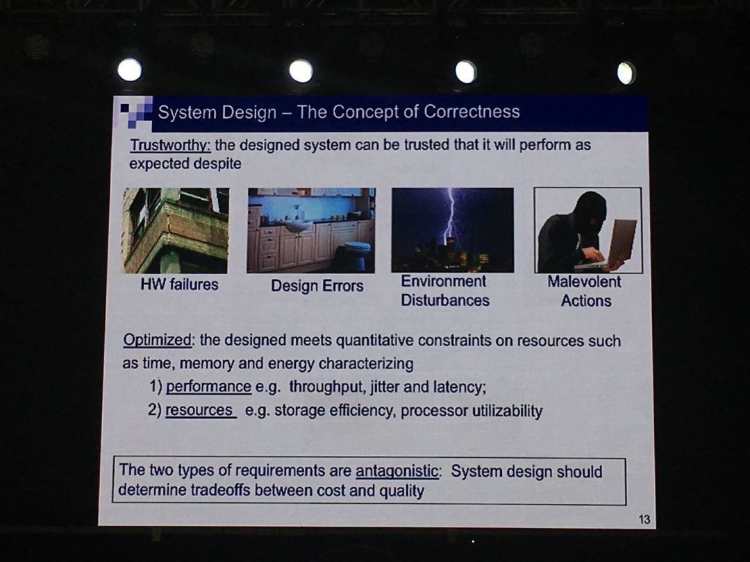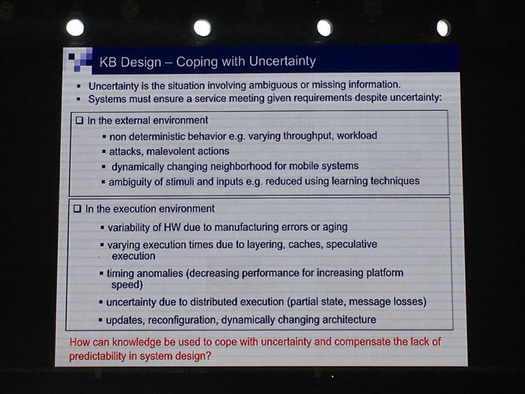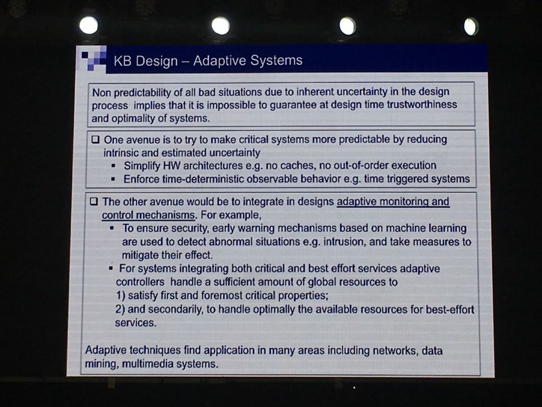 需要我们在进行系统设计的同时,也考虑到设计的标准:需要考虑到系统必须是非常值得信任的。我们还有一些可以控制的系统,可以进行和系统、环境之间更好的合作,这就是适应型的控制器,如此一来,这个系统就会变得足够安全。有的时候,系统也会出现一些问题,我们要对系统进行监控。如果问题出现,我们需要降低这些缺陷,这是共识。我们经常在有些区域运用这些方法,计算系统中有各种控制理论,我们使用控制为基础的各种技术来确保计算的正确性。尽管如此,还是出现了一些不可预估的风险,所以一开始的系统的设计就显得非常重要,我们需要确保这一点。以知识为基础的设计(包括它的设计时间的知识),有时,我们不能保证这个设计时间,因此,我们需要建立一些特性,设计流程的某些步骤能够保证真正在执行的时间,能够保证完全真实的执行情况。