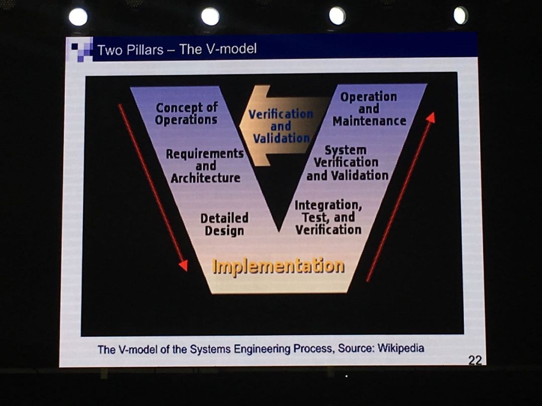 我们依赖两个技术,一个是验证,一个是测试。验证指的是,你可以证明你的系统能够正确地运行,并且是基于模式的。你有一个模式,然后还有要求,有形式化要求,有模式的形式化,你用专业的知识来使这个系统符合这些要求。