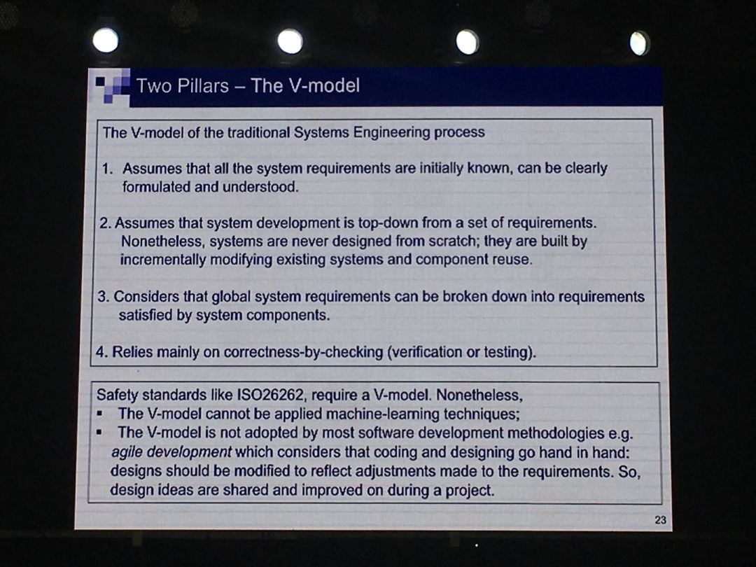 现在,我们有很多硬件平台,为了开发一个可靠的模式,在这个模式下,我们需要验证这个系统,并且还会出现很多可能的失误。因此,系统验证是一个非常难的任务。我们需要理解的非常重要的一点是,虽然自动系统中有机器学习技术,但是我们也没有办法来验证机器学习。因为在神经网络中,当你开发一个神经网络的时候,而没有办法对神经网络进行验证。因为没有(对神经网络的)要求,所有没有办法来验证这个神经网络,这就意味着神经网络没有办法用来系统地验证。